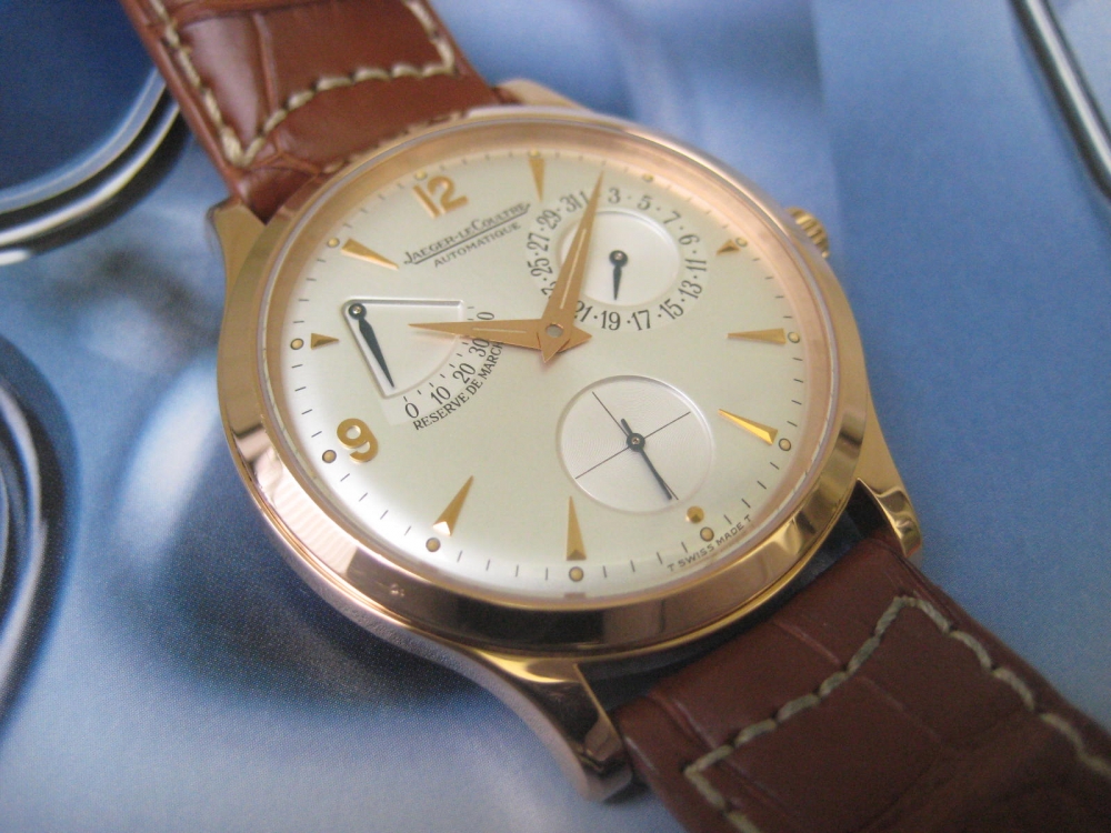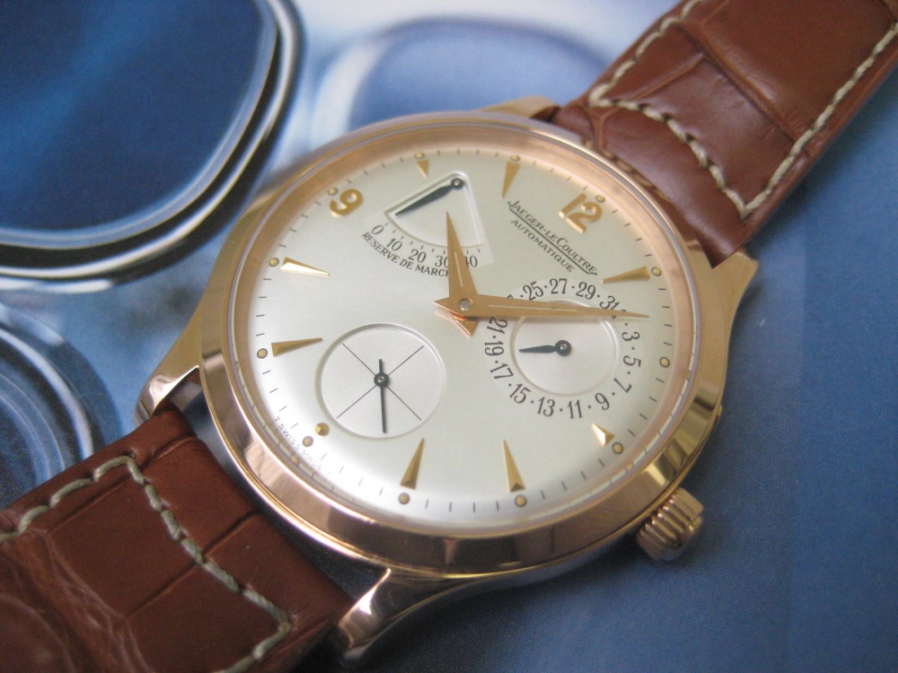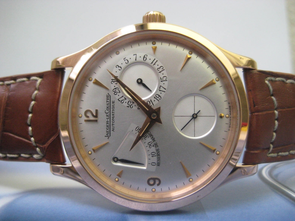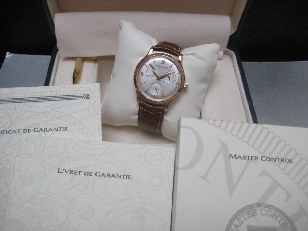 Timeless and scarce Master Control power reserve in solid Pink gold, unpolished, neraly like new and collector item now, full set box and papers.