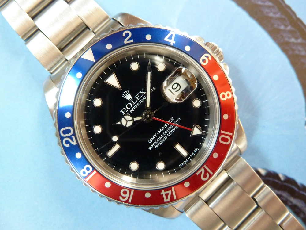 1990 Gmt master transitional, pepsi original bezel, tritium dial, fliplock bracelet, comes complete with all booklets and tags, box and Rolex service.